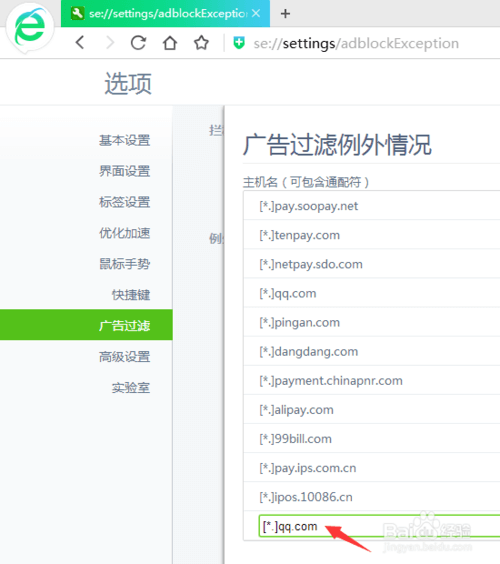 打开选项/设置-广告过滤-管理例外网站(或在浏览器地址输入se://settings/adblockException),添加域名,格式为[*.]域名