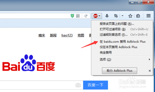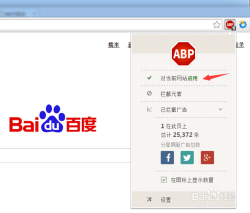 点击右上方的Adblock图标,下拉菜单中点击在 xxx 禁用 Adblock Plus