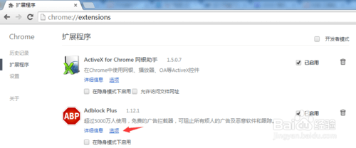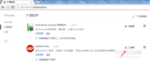 打开谷歌浏览器的扩展程序(或在浏览器地址输入chrome://extensions/),禁用Adblock。