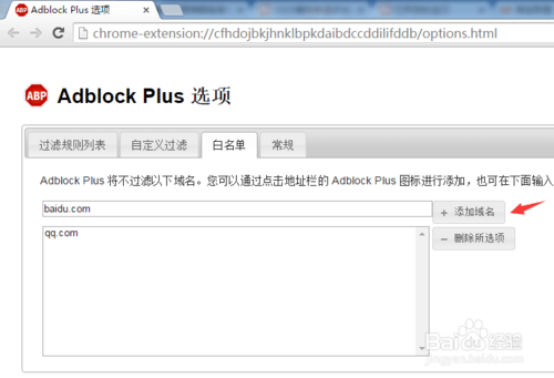 打开谷歌浏览器的扩展程序(或在浏览器地址输入chrome://extensions/),点击Adblock的选项-白名单选项卡,添加本站域名。