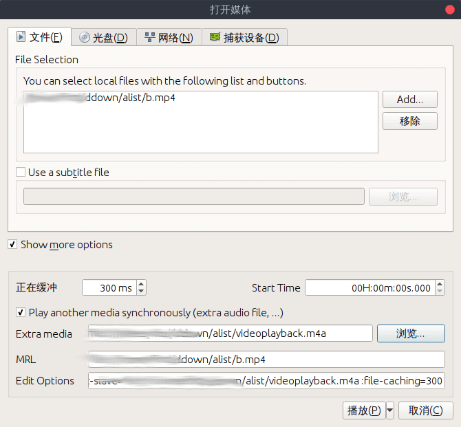 点击左上角的 媒体--》转换/保存 ,添加视频文件以后,勾选下面的显示更多选项,再勾选同时播放其他媒体文件,会再次弹出一个选择媒体的窗口,只需要选择音频文件并点击选择。