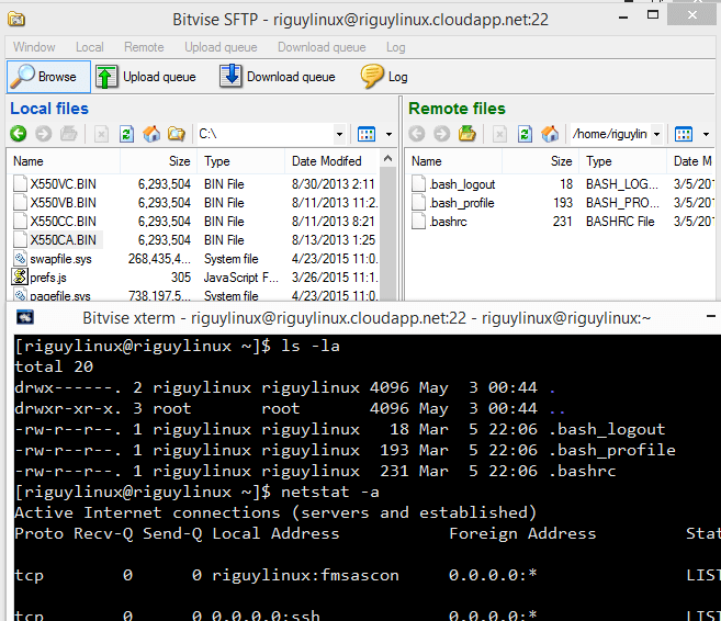此时会弹出一个命令行窗口即为后台,同时会弹出一个sftp的界面,可以图形化的来上传或者下载文件。