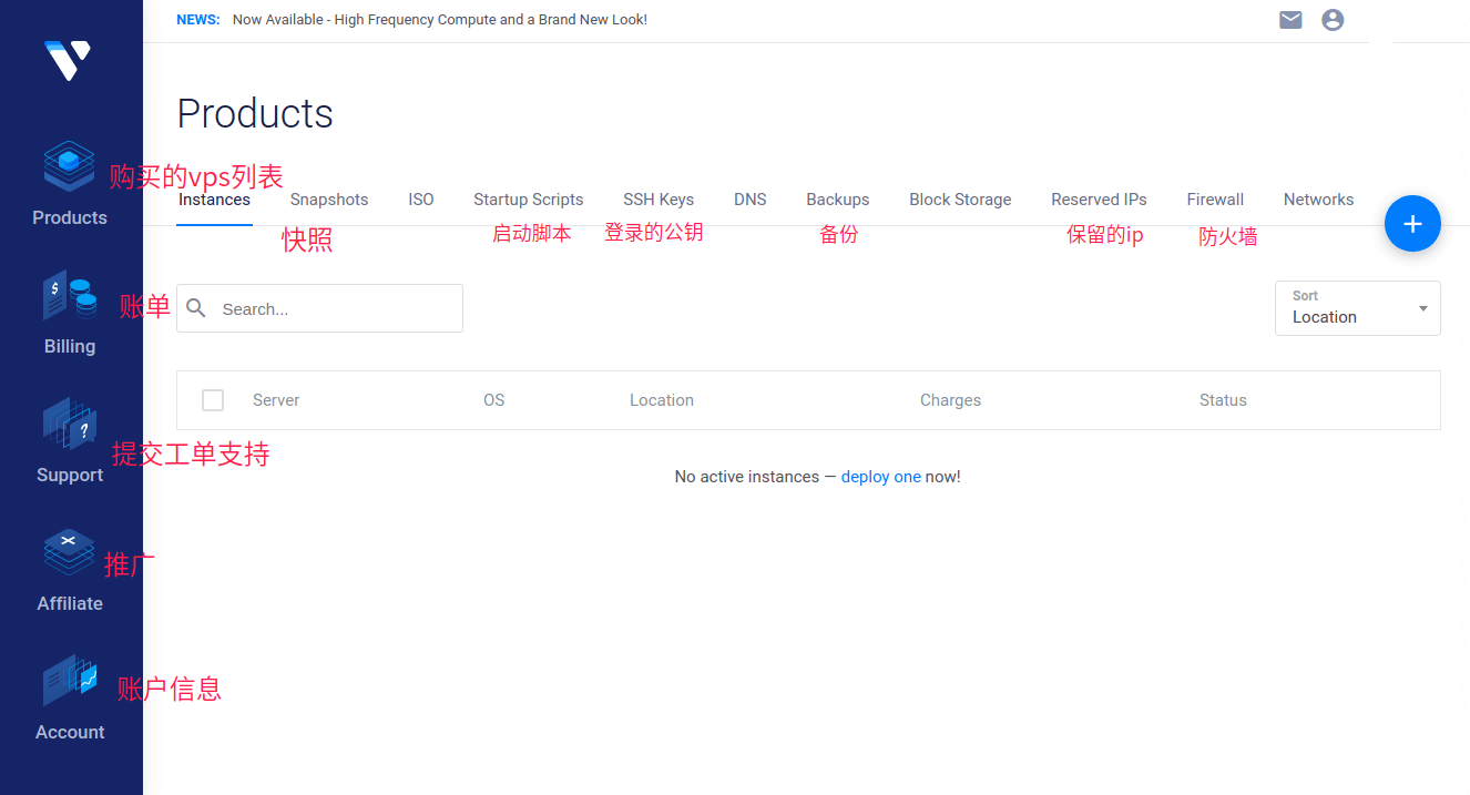 页面右上角有个绿色圆饼,中间白色加号,即为添加新的vps实例按钮,点击即可进入添加步骤。